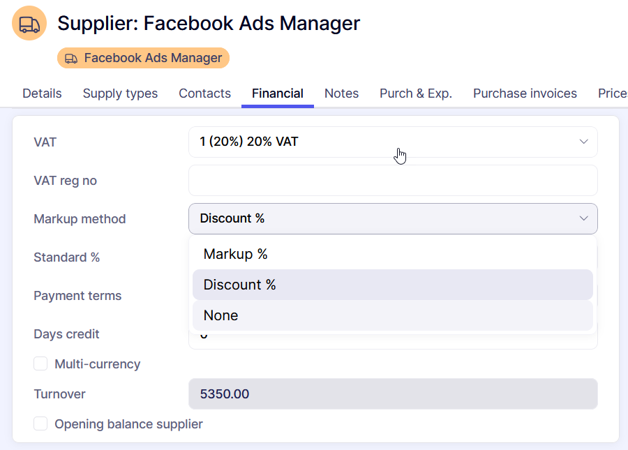 Create or open a supplier in the usual way from the list of suppliers. On the ‘Financial/Notes’ tab change the ‘Markup method’ from ‘Markup %’ to ‘Discount%.
