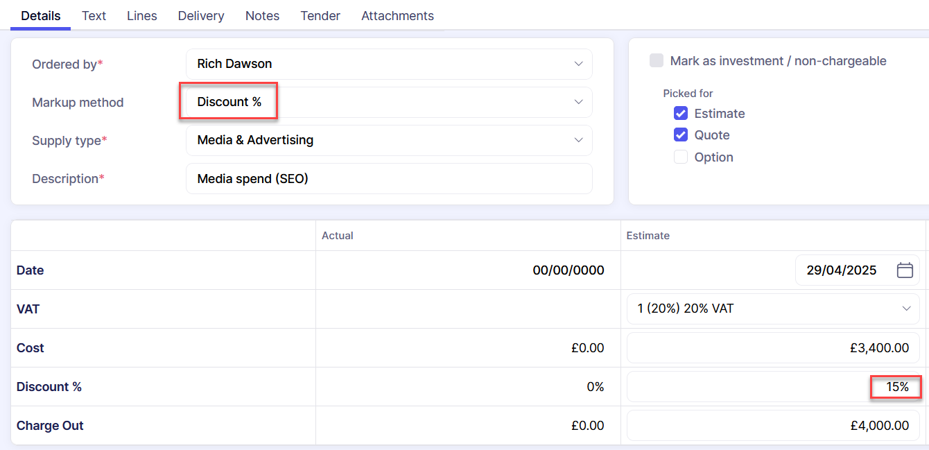 Create a purchase estimate / order in the normal way. As part of this procedure, you will select a supplier. If the supplier you select is a media supplier, who is set to use ‘Discount%’, the purchase order will automatically be set to being a discount style purchase. However, you can change this if you ever need to by selecting a different ‘Markup method’.