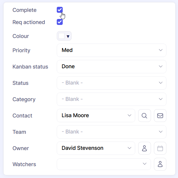 Kanban boards rely on the work requests' Complete status as well as the Kanban status. To make this easier, the process is automatic. If a work request is marked as ‘Complete’, the Kanban status is automatically updated. Similarly, if you un-complete a work request , the Kanban status is also adjusted.