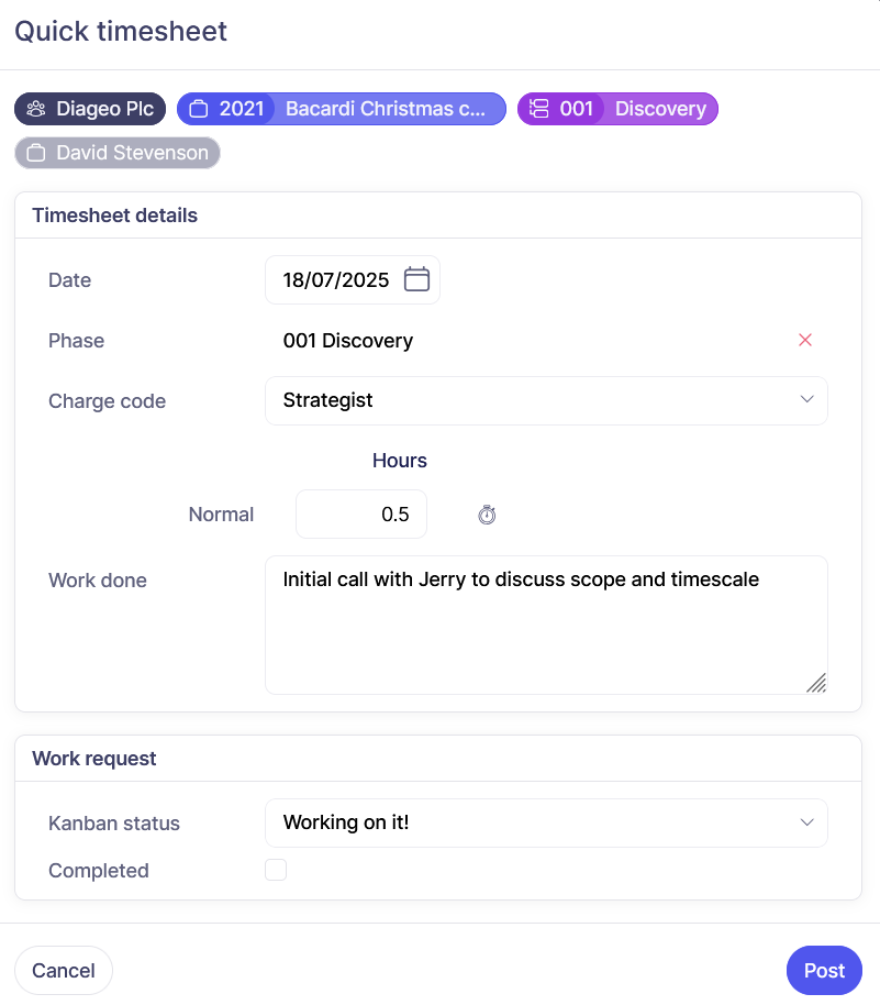 This opens a window where you can enter the phase (for a job level task), charge code, time spent and work done notes. The date defaults to the current day's date. From this window you can change the kanban status on the task and/or mark the task as complete. Click 'Post' to enter the timesheet.