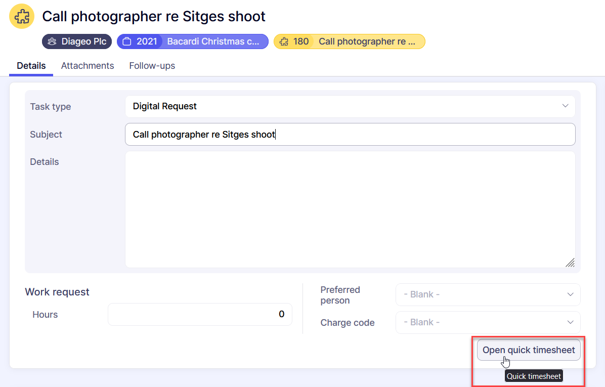 Note: You can restrict the creation of quick timesheets from a task to the task owner only or allow it for any user. You can also disable this feature. To change these settings go to Settings, File Maintenance, Task Types. Open the requisition task type, under 'Can create timesheet' select 'Owner only', 'Anyone' or 'No'.