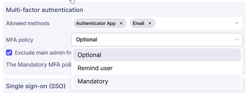 Note that the mandatory option on the MFA policy drop-down will only appear to you in the list if the user you are logged in as has enabled MFA on the user account.