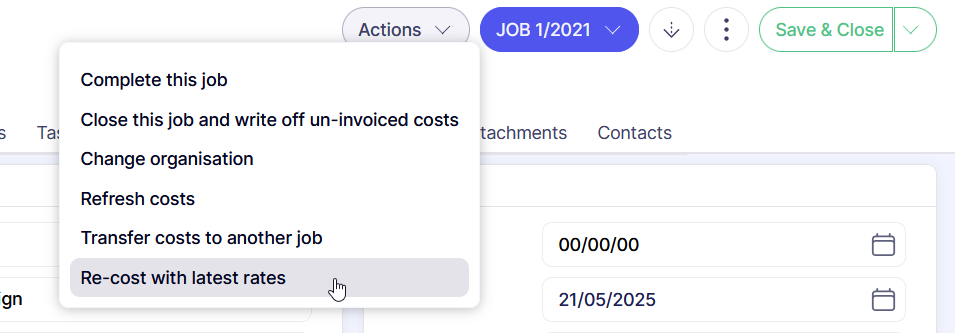 The re-cost jobs utility is available from within a single job or a single phase, and is also available on the batch update menu on the job and phase lists. It is useful to correct actual cost & charge out values on time & materials submitted in the past based on updated current costs / charge rates set in file maintenance.