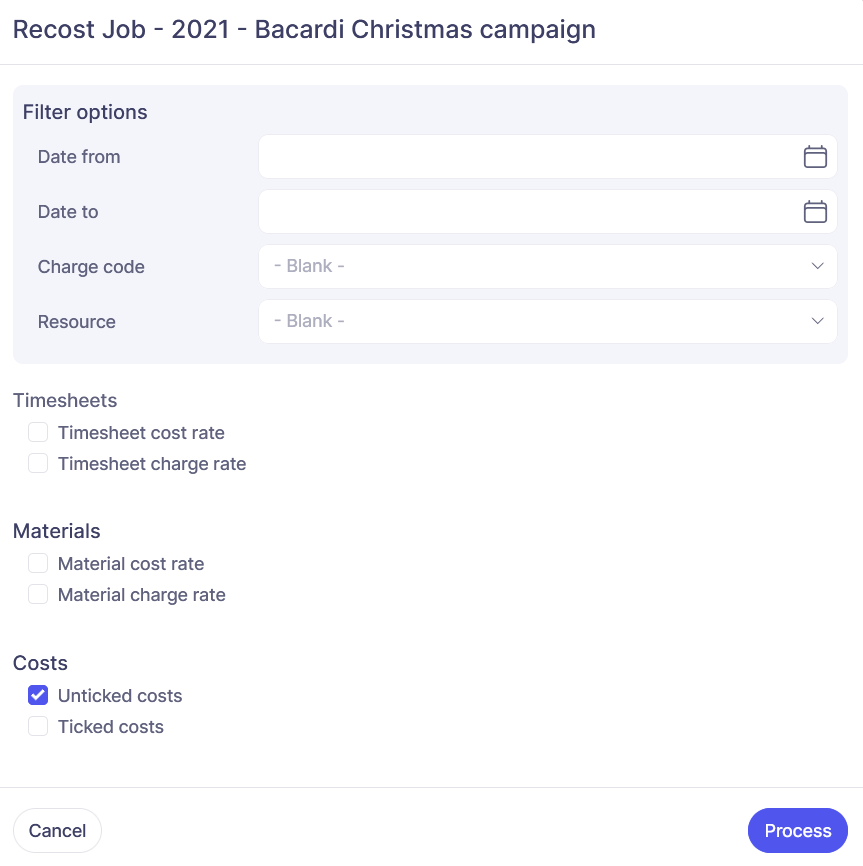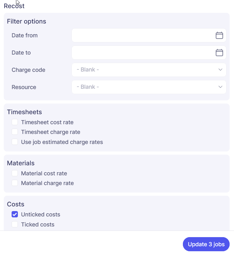 Finally you can choose to include ticked or unticked costs. The default is to only include unticked costs as these will not have been used in any reported profit calculations. If you are certain that re-costing ticked off costs is safe to do and will not impact on previously used profit reports then you can choose to also include ticked off costs in the selection.