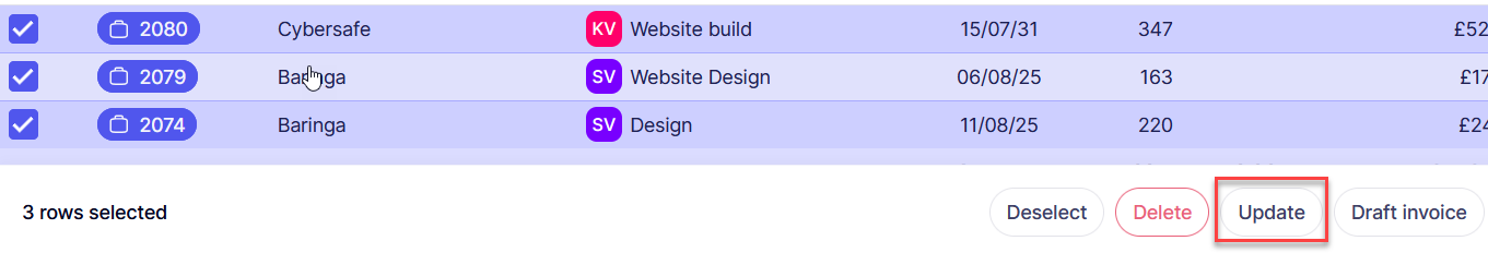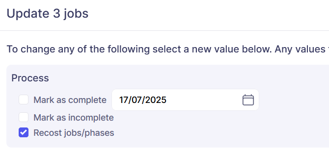 To re-cost a selection of jobs or phases open the relevant list and either filter the list to include those jobs / phases to be re-costed, or select the jobs to be re-costed from a larger list by ticking the box next to them. Once the selection is made click update in the actions bar below the list: