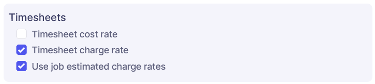 You can choose to update cost rate, charge rate or both. If charge rate is selected you will be offered the option to use job / phase estimated charge rate (as opposed to the base file maintenance rate). You should choose this option if you use client prices or some other mechanism to fix charge rates at job level rather then every new timesheet picking up the base rate from file maintenance (team / staff / charge code etc).